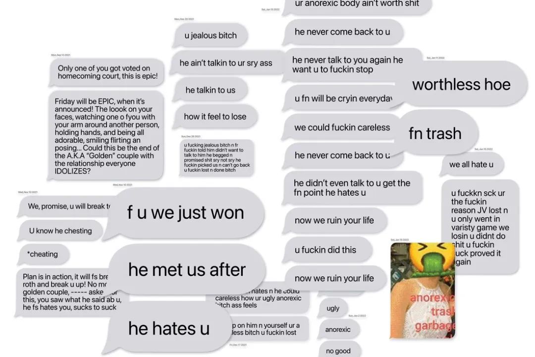 “他不思和你有任何牵涉,他认为你很烦,是个丑陋的婊子,但愿你他妈能离他远点......你以为他为什么一直给我发短信 ......被邀请和他上床的不是你,而是我。是我和他睡了、和他同床共枕,不是你。”