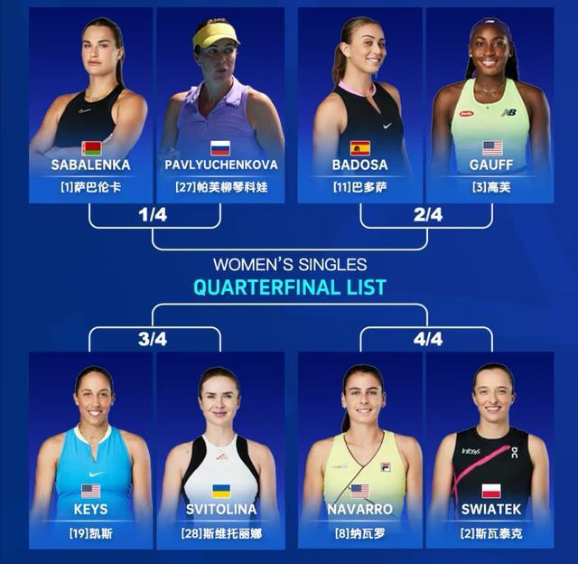 女单八强和男单相通,亦然三巨头荟萃,辞别是头号种子萨巴伦卡、2号种子斯瓦泰克、3号种子高芙、8号种子纳瓦罗、11号种子巴多萨、19号种子凯斯、27号种子帕芙柳琴科娃和28号种子斯维托丽娜。开赛前,媒体瞻望的4大夺冠热点里,仅郑钦文1东说念主掉队,萨巴伦卡、斯瓦泰克和高芙王人还在签表中。