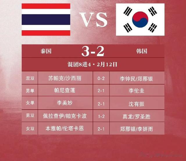 泰国队先是在搀和双打的比赛当中先声夺东说念主而。泰国队靠近舒帕克和沙西利这对全新的组合最终是拿下敌手此外皮须眉单打和女子单打的比赛当中麇集折戟。而泰国队在本次须眉单打,并莫得昆拉武特参赛,而且李私密匡助泰国队更是拿到了赛点。真龙和罗盛盛的组合匡助韩国队更是在须眉双打方面强势扳平。比赛来到了2:2终末的女子双打对决韩国队爆冷暗沟翻船最终是2:3落败。