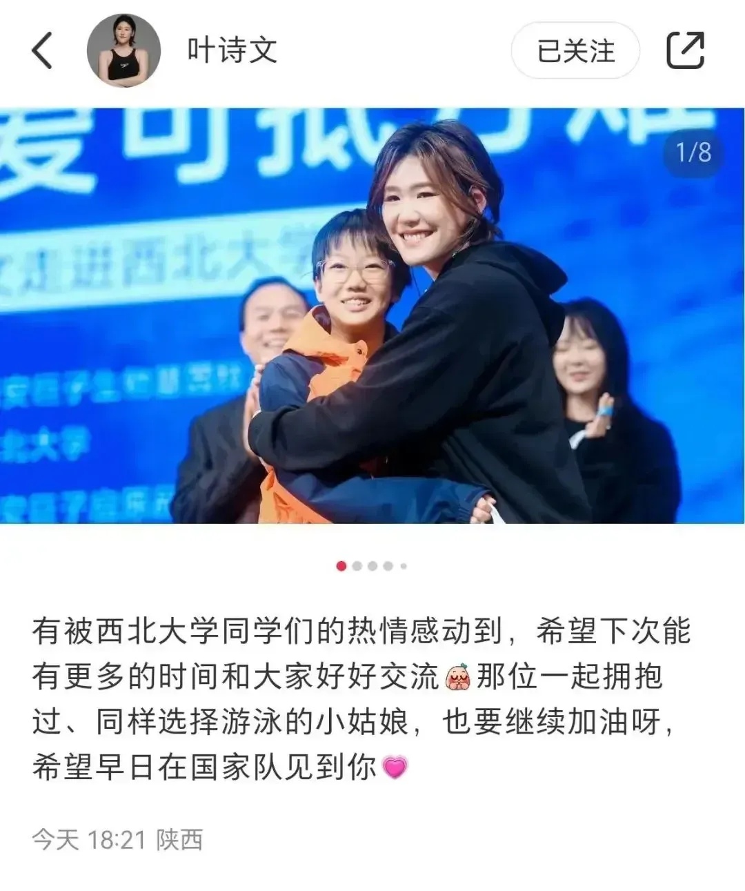 据西北大学官微讯息,11月3日,游水世界冠军叶诗文受邀到西北大学,与学子共话成长。