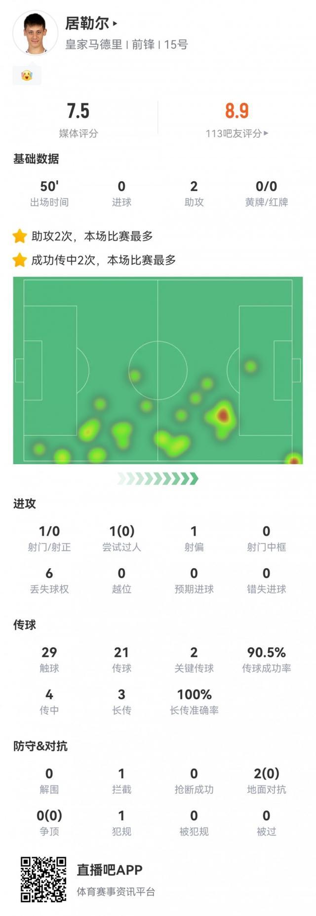 直播吧1月17日讯 国王杯1/8决赛,皇马5-2加时慑服塞尔塔。此役居勒尔替补登场50分钟,球员全场重心数据如下↓