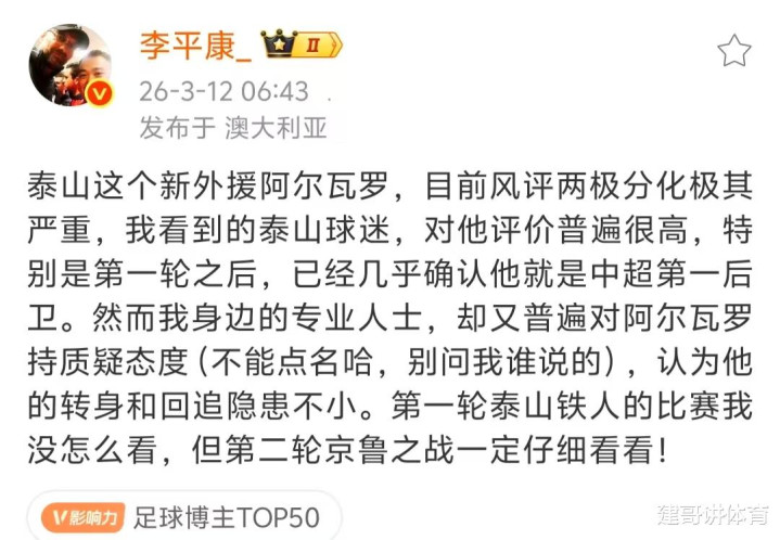 北京时分3月12日,取得了泰山球迷认同的泰山队新外助中卫阿尔瓦罗,被名记李平康点了名,李平康以为泰山球迷对他评价很高,中超第一轮比赛后就阐发他是中超中超第一后卫,但我身边的专科东说念主士却大齐怀疑阿尔瓦罗的智力,他的回身和回追隐患不小,第二轮京鲁大战一定要好面子看他的推崇。