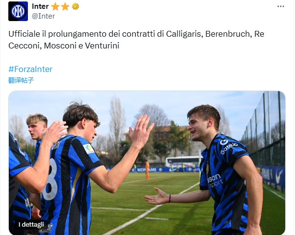 国米俱乐部在官网发布公告称:“国米俱乐部晓谕一经兑现条约,和阿列桑德罗-卡林加里斯、贝伦布鲁赫、加布里埃尔-雷切科尼、马蒂亚-莫斯科尼、马特奥-文图里尼这5名球员签署了多年合同。”不外国米莫得显现每位球员的续约合同细节。