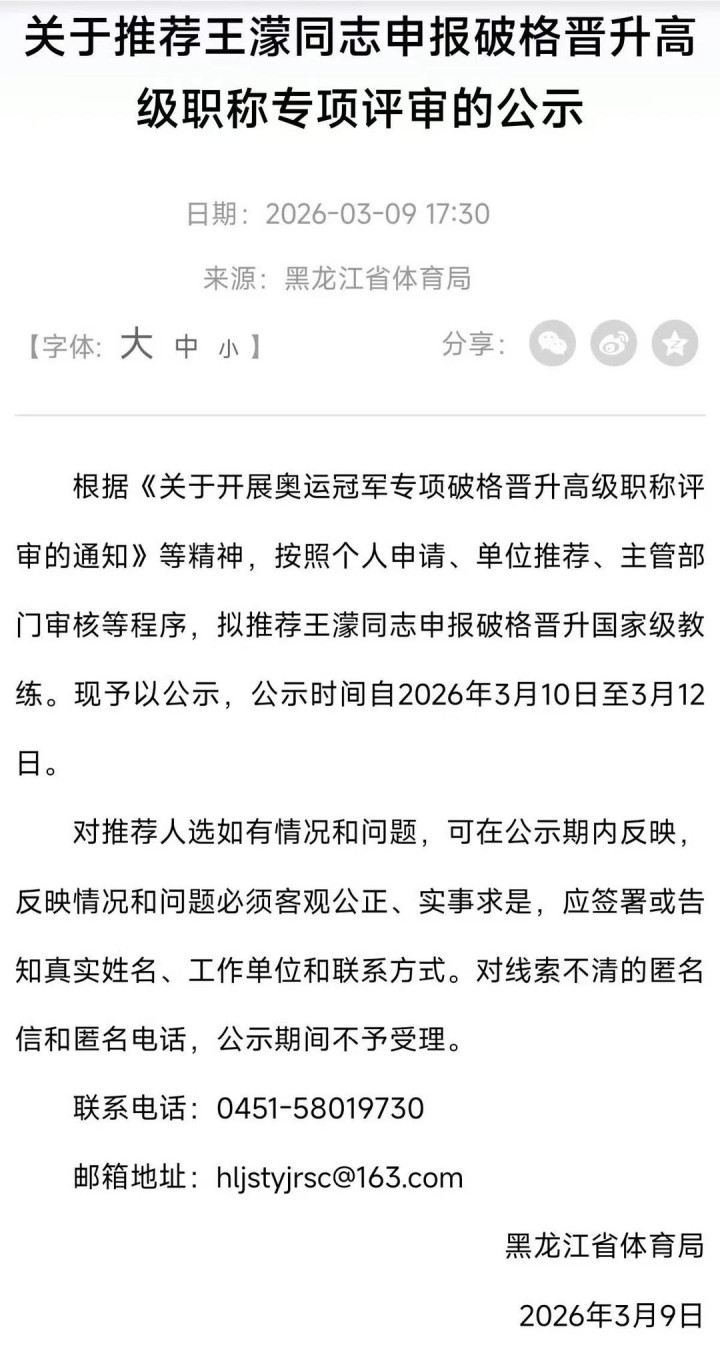3月9日,黑龙江省体育局官网厚爱公示: